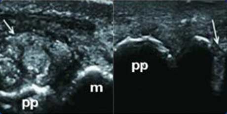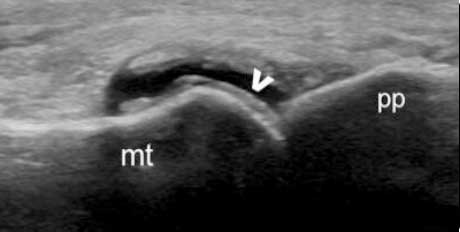 跖趾关节软骨表面可见高回声不规则增强的软骨滑膜边缘线,呈“双轨征”。